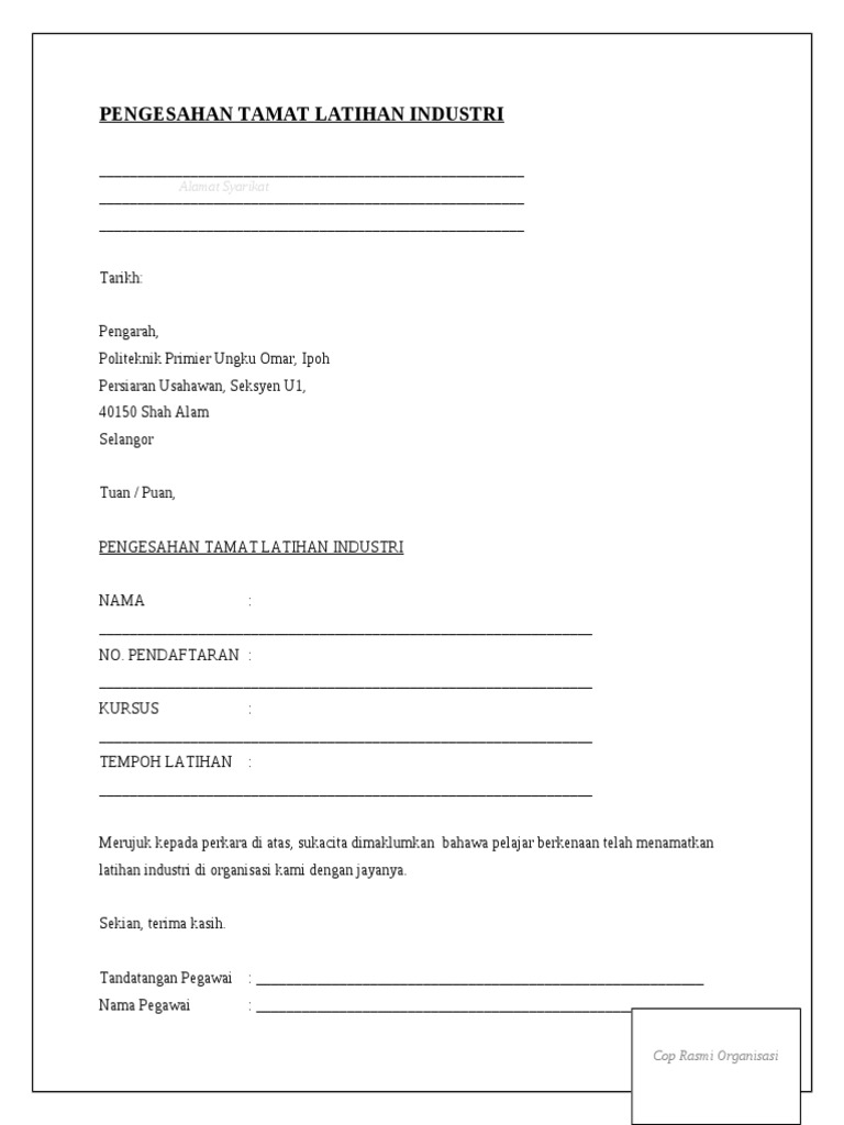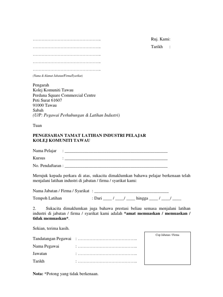 Contoh Surat Pengesahan Tamat Latihan Industri Pdf from imgv2-1-f.scribdassets.com Check spelling or type a new query. We did not find results for: Maybe you would like to learn more about one of these? Contoh surat penghargaan tamat latihan industri.